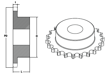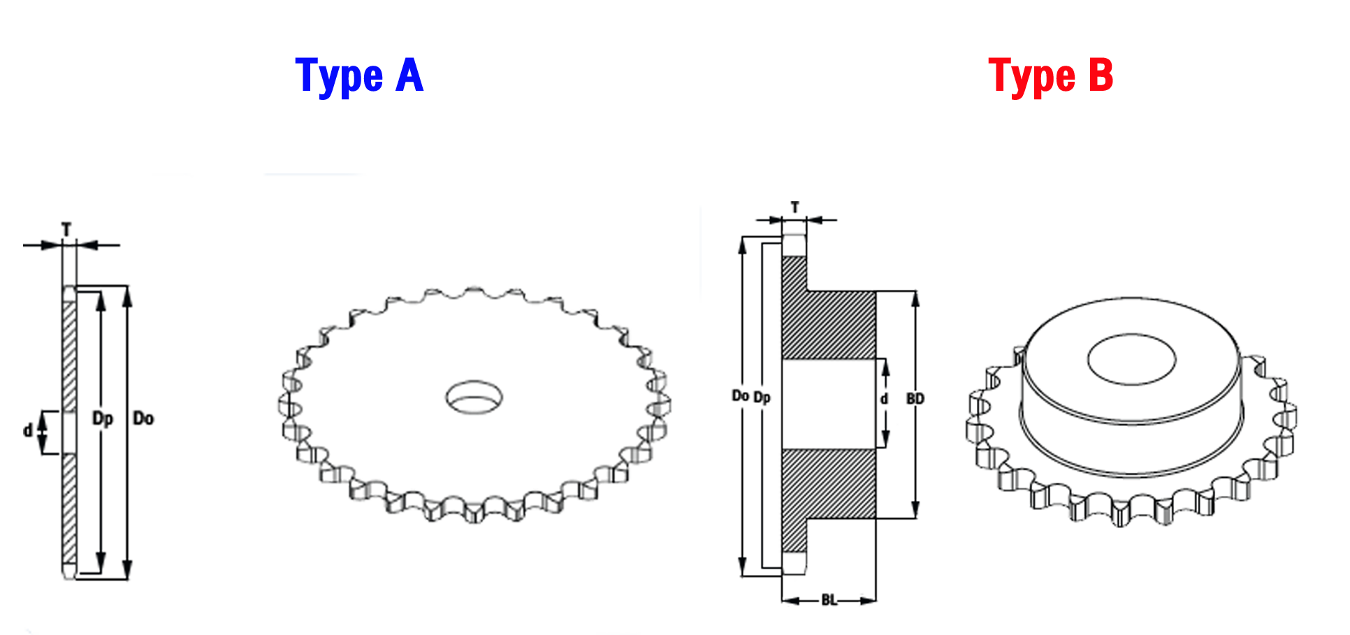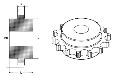 | Type ( B-type ) | No.of Teeth (ฟัน) | Outside Dia. (Do) | Pitch Dia. (Dp) | Shaft Bore Dia. (d) | Hub Dia. (BD) | Hub Length (BL) | Weight (kg.) | Model เบอร์เฟือง-จำนวนฟัน | ||